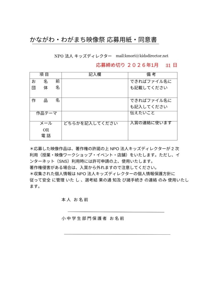 かながわ・わがまち映像祭 開催 2026.01.16 多様な作品が集まる小中学生部門・一般部門の地域映像祭です アニメ~ドキュメンタリーなど多様な作品が集まります 共有: Facebook で共有するにはクリックしてください (新しいウィンドウで開きます) Facebook クリックして X で共有 (新しいウィンドウで開きます) X